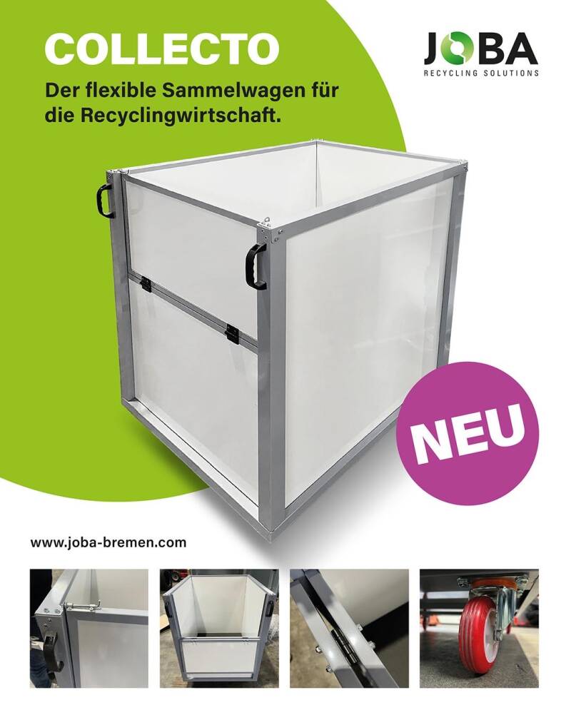 Mit dem COLLECTO bringt JOBA eine echte Innovation für die Recyclingwirtschaft auf den Markt. Der Sammelwagen überzeugt durch seine Vielseitigkeit: Er ist flexibel einsetzbar – vom Altkleider-Container bis hin zum Einzelhandel für Papier, Pappe oder andere Wertstoffe.